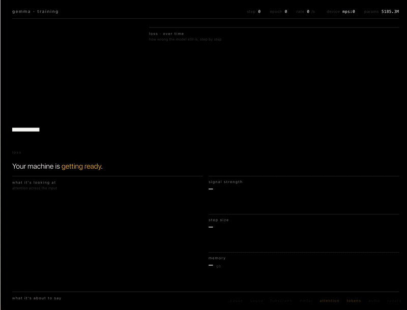 The loss curve sweeps across the screen — that’s how wrong the model is, how surprised it is by the truth. You watch it drop. The attention heat map lights up, showing you which parts of the input the model is focusing on. Gradient signal strength, step size, RAM usage — everything exposed. Everything visible.